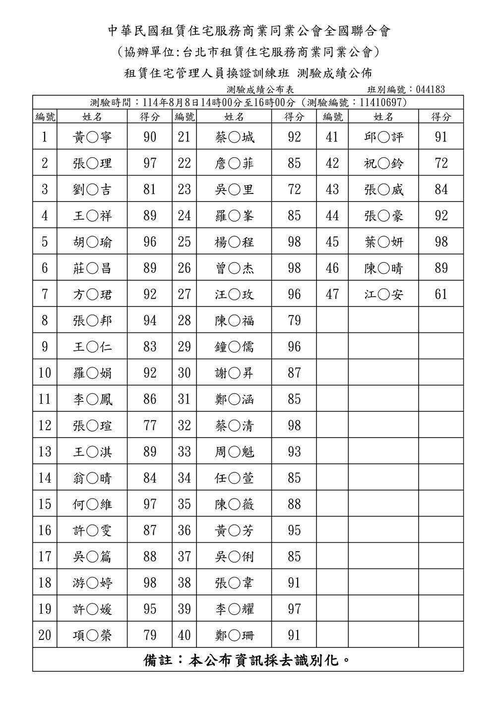 (複訓)114年8月份【租賃住宅管理人員專業訓練班】測驗成績單