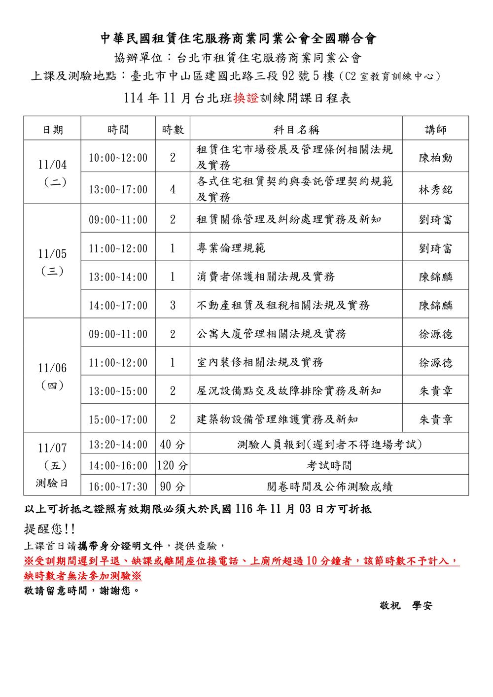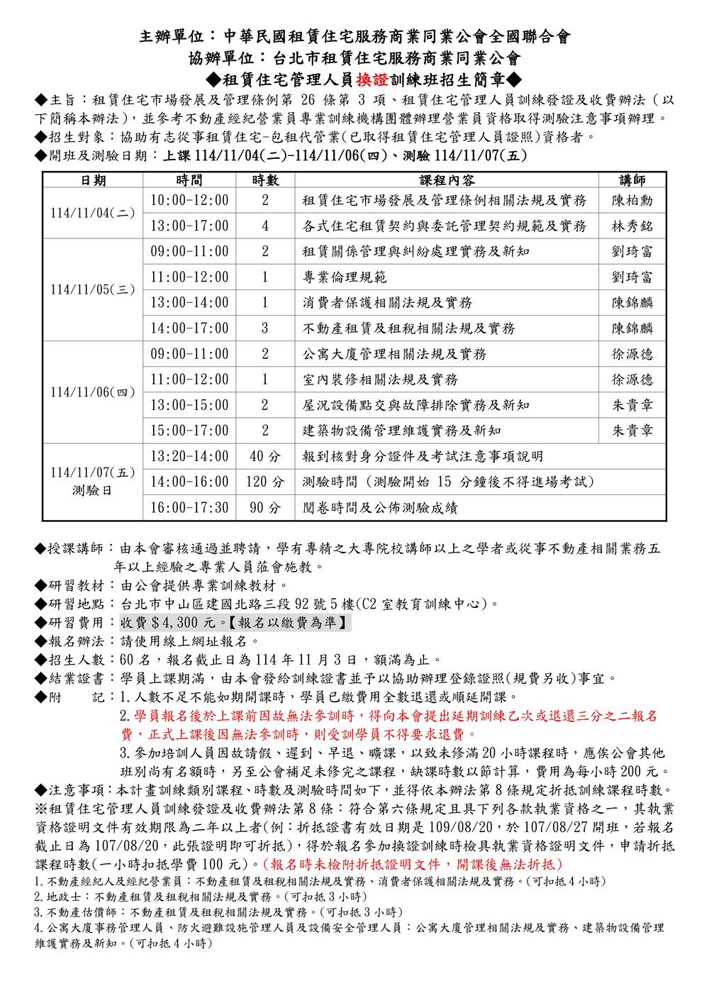 (複訓)114年11月份【租賃住宅管理人員專業訓練班】