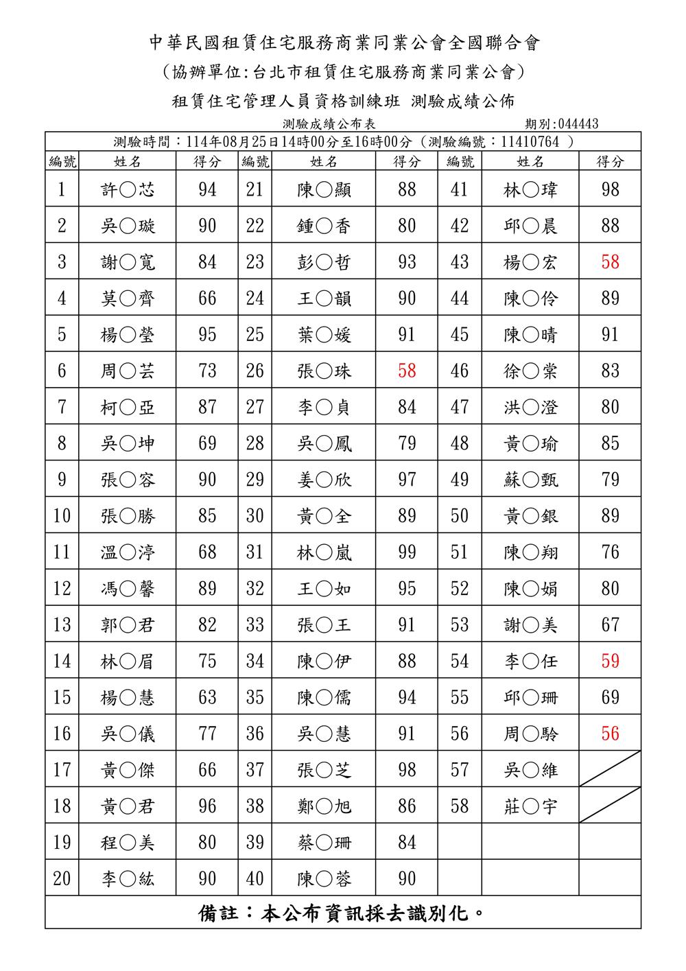 (初訓)114年8月份【租賃住宅管理人員專業訓練班】測驗成績單