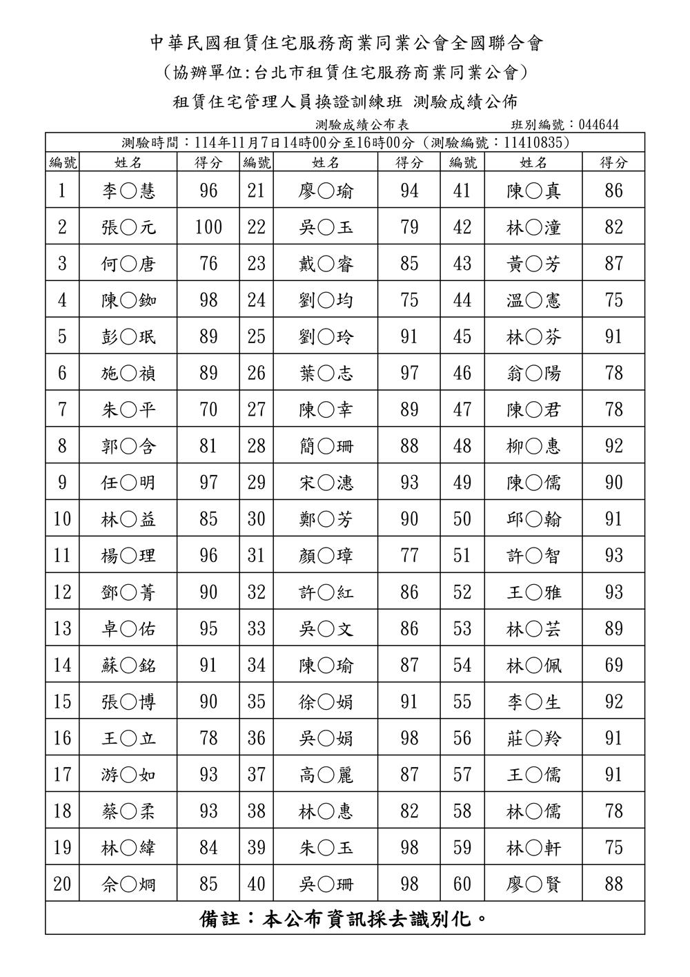 (複訓)114年11月份【租賃住宅管理人員專業訓練班】-測驗成績單