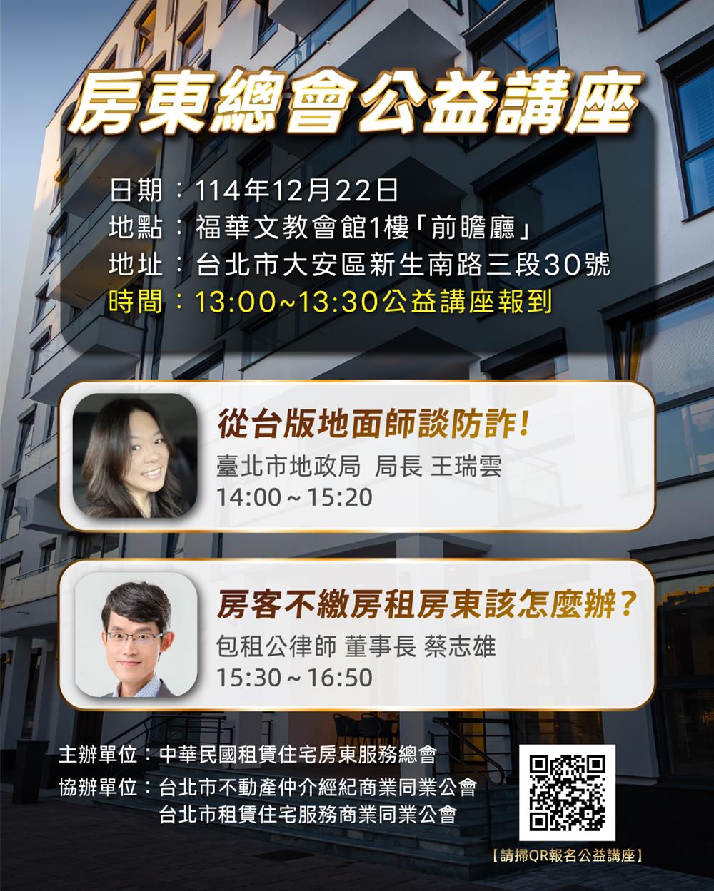 由「中華民國租賃住宅房東服務總會」主辦、「台北市租賃住宅服務商業同業公會」協辦之【防詐公益講座】 圓滿完成。