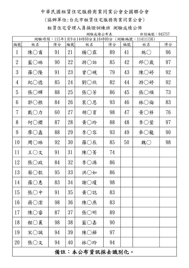 (複訓)115年1月份【租賃住宅管理人員專業訓練班】-測驗成績單
