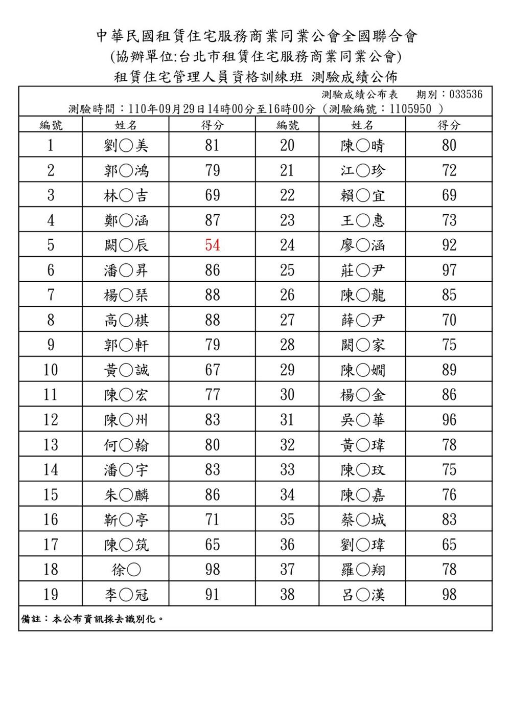110年9月份【租賃住宅管理人員專業訓練班】測驗成績單