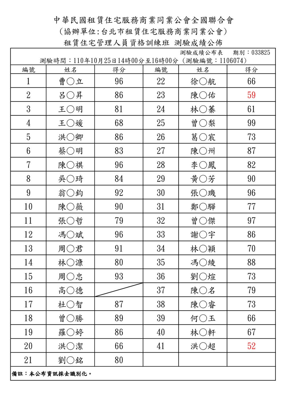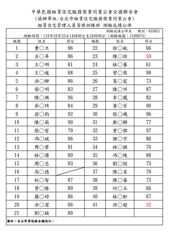 110年10月份【租賃住宅管理人員專業訓練班】測驗成績單