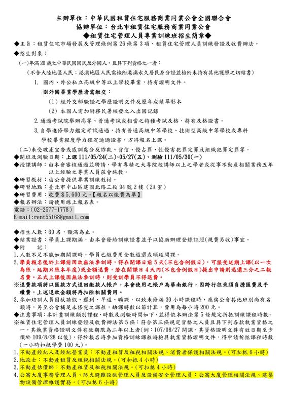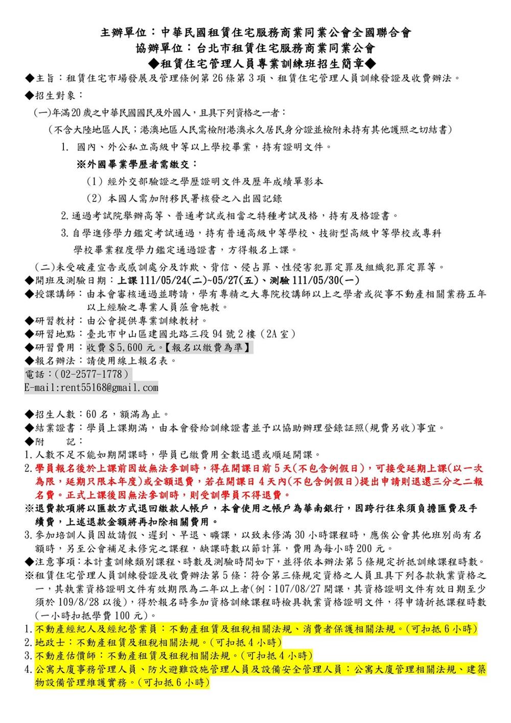 (初訓)111年05月份【租賃住宅管理人員專業訓練班】