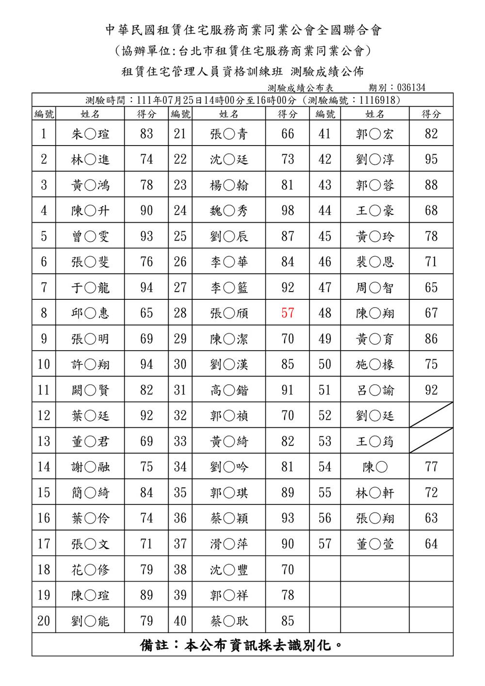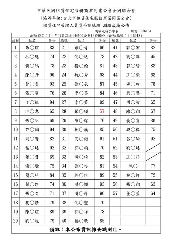 111年07月份【租賃住宅管理人員專業訓練班】測驗成績單