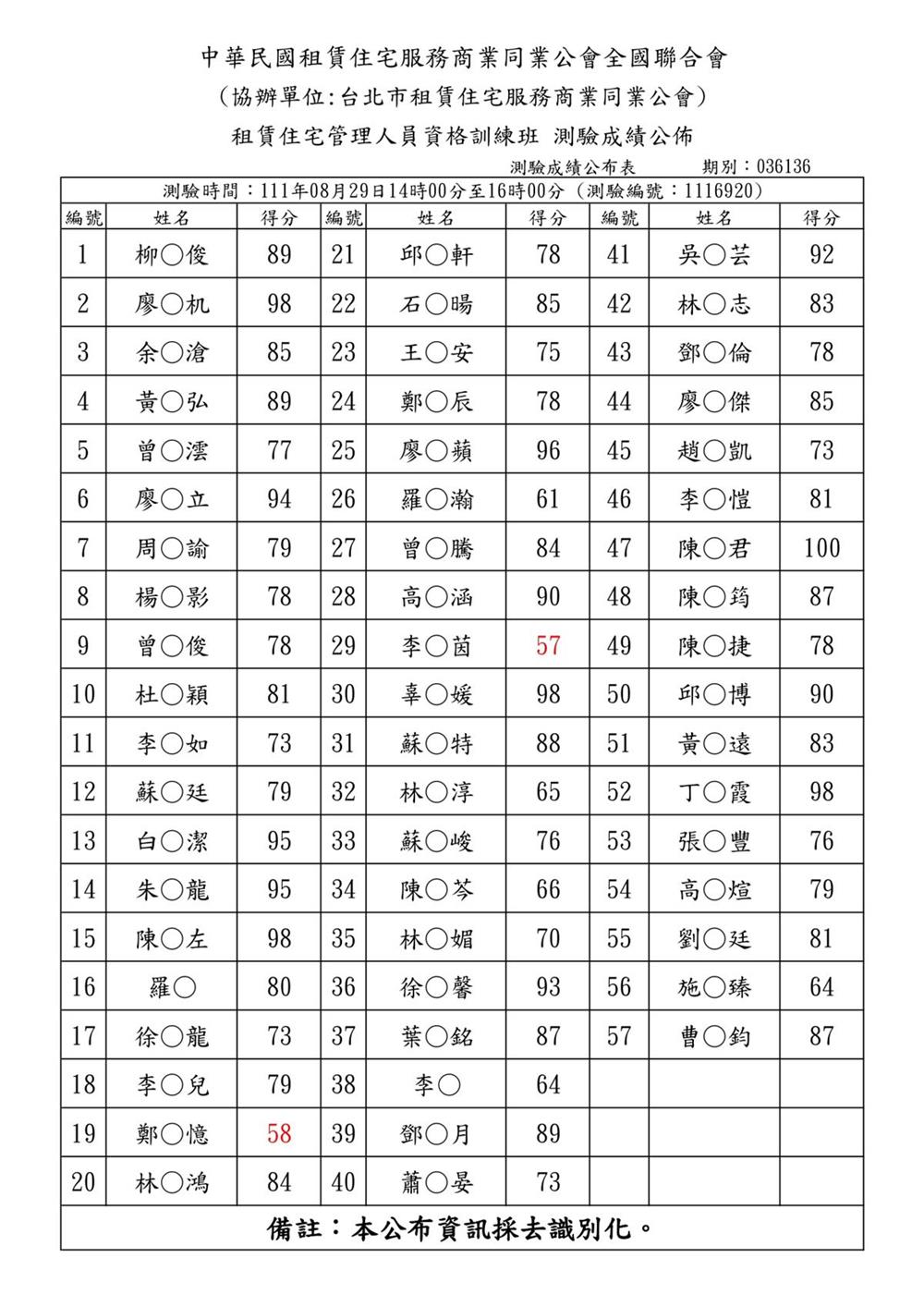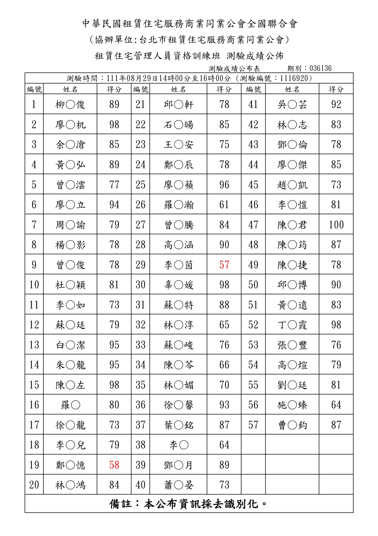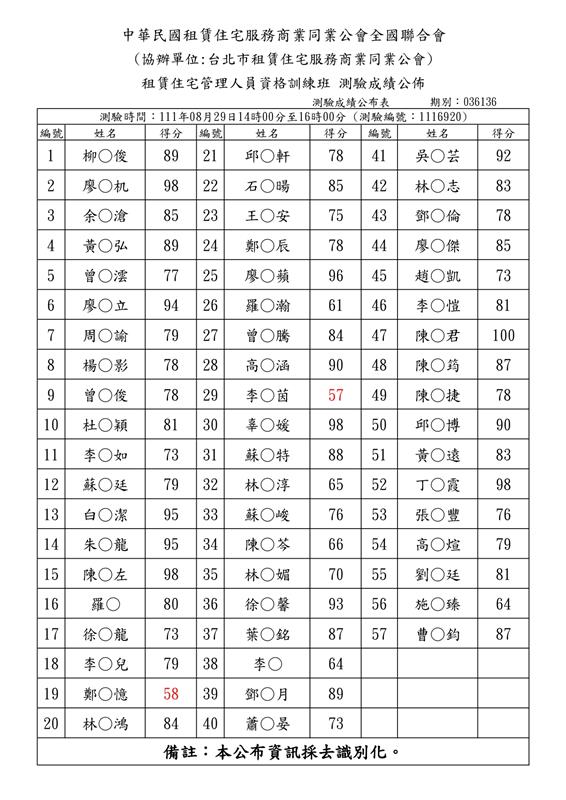 111年08月份【租賃住宅管理人員專業訓練班】測驗成績單