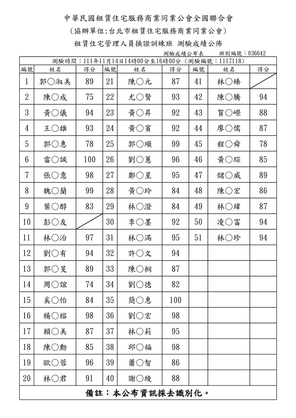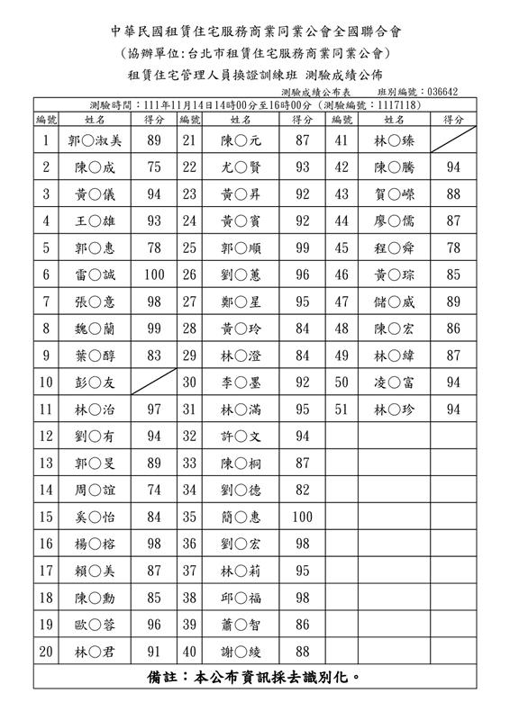 (複訓)111年11月份【租賃住宅管理人員專業訓練班】測驗成績單