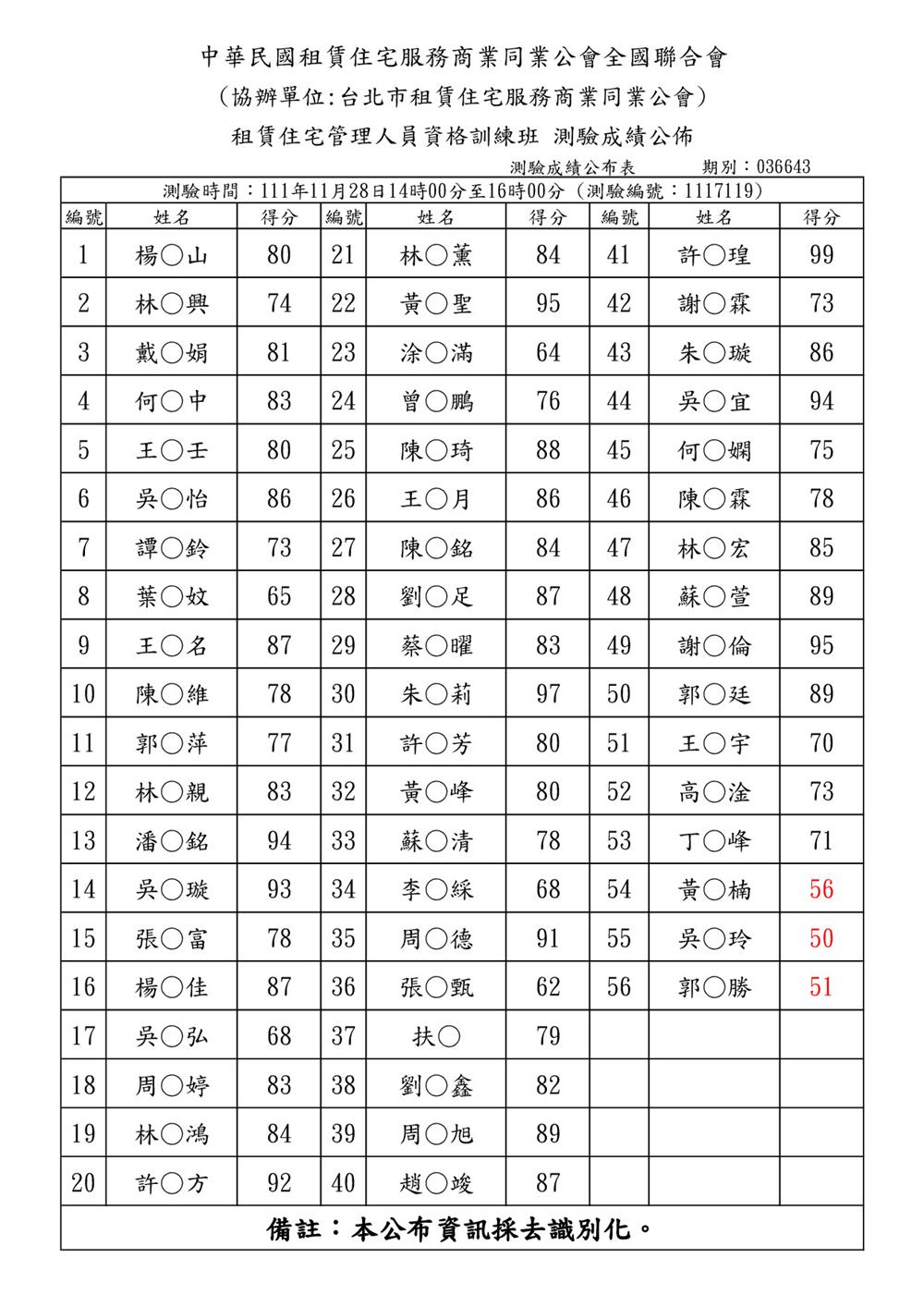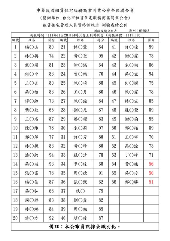 (初訓)111年11月份【租賃住宅管理人員專業訓練班】測驗成績單