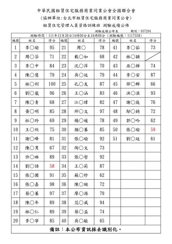 (初訓)111年12月份【租賃住宅管理人員專業訓練班】測驗成績單