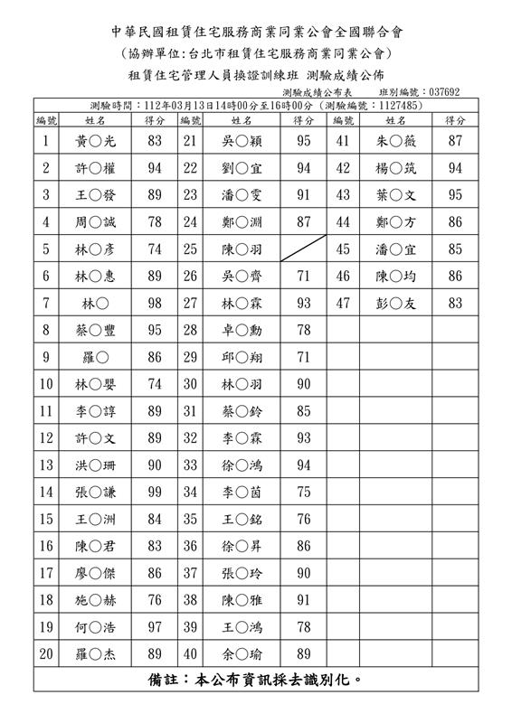 (複訓)112年3月份【租賃住宅管理人員專業訓練班】測驗成績單