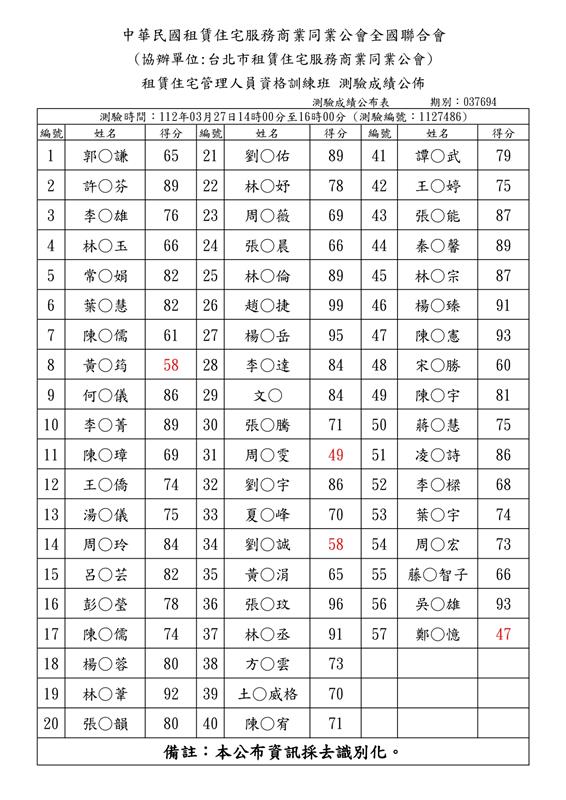 (初訓)112年03月份【租賃住宅管理人員專業訓練班】測驗成績單