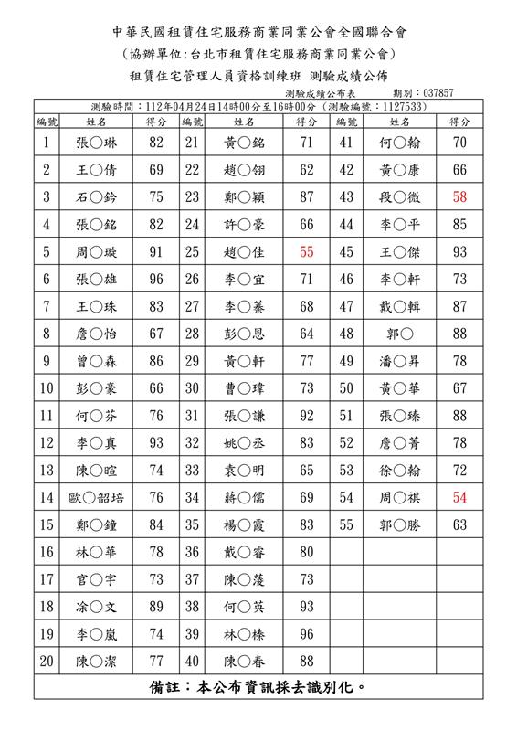 (初訓)112年04月份【租賃住宅管理人員專業訓練班】測驗成績單