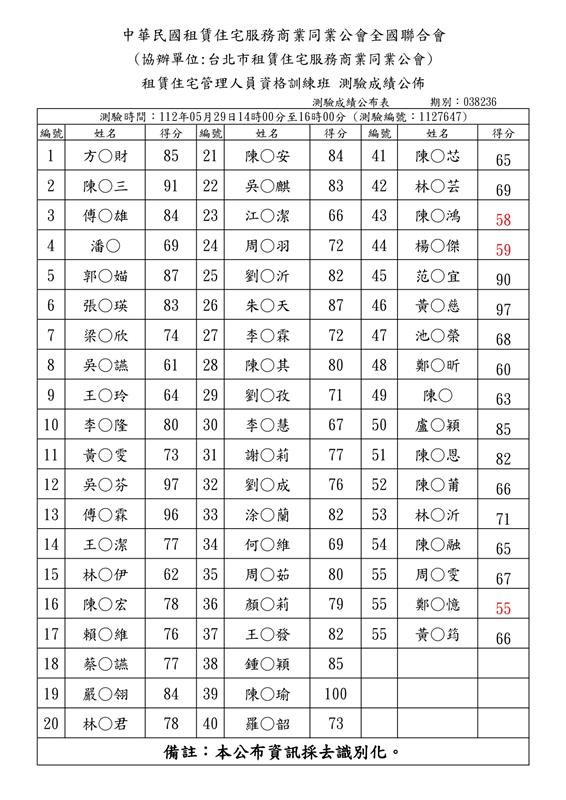 (初訓)112年05月份【租賃住宅管理人員專業訓練班】測驗成績單