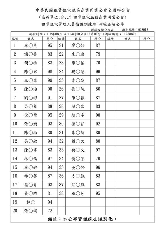 (複訓)112年8月份【租賃住宅管理人員專業訓練班】測驗成績單