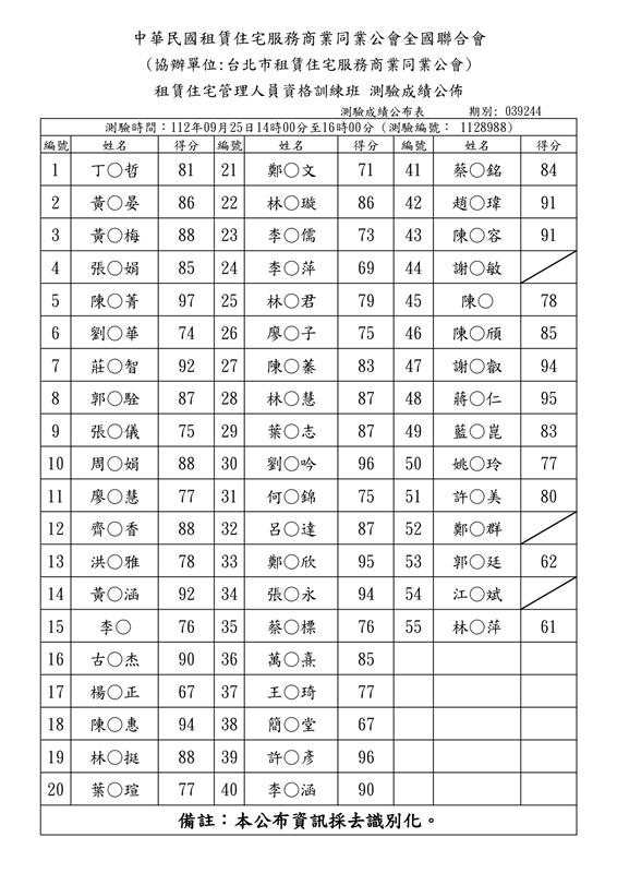 (初訓)112年9月份【租賃住宅管理人員專業訓練班】測驗成績單