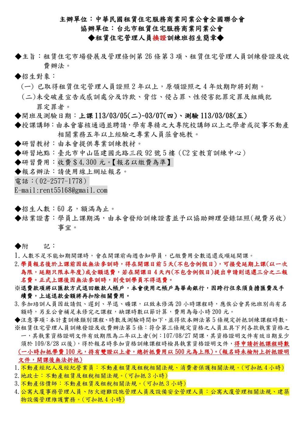 (複訓)113年3月份【租賃住宅管理人員專業訓練班】