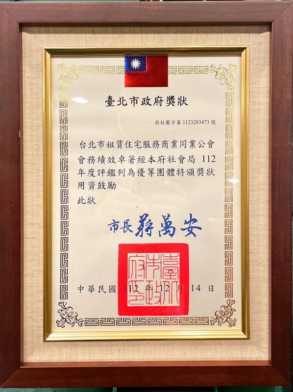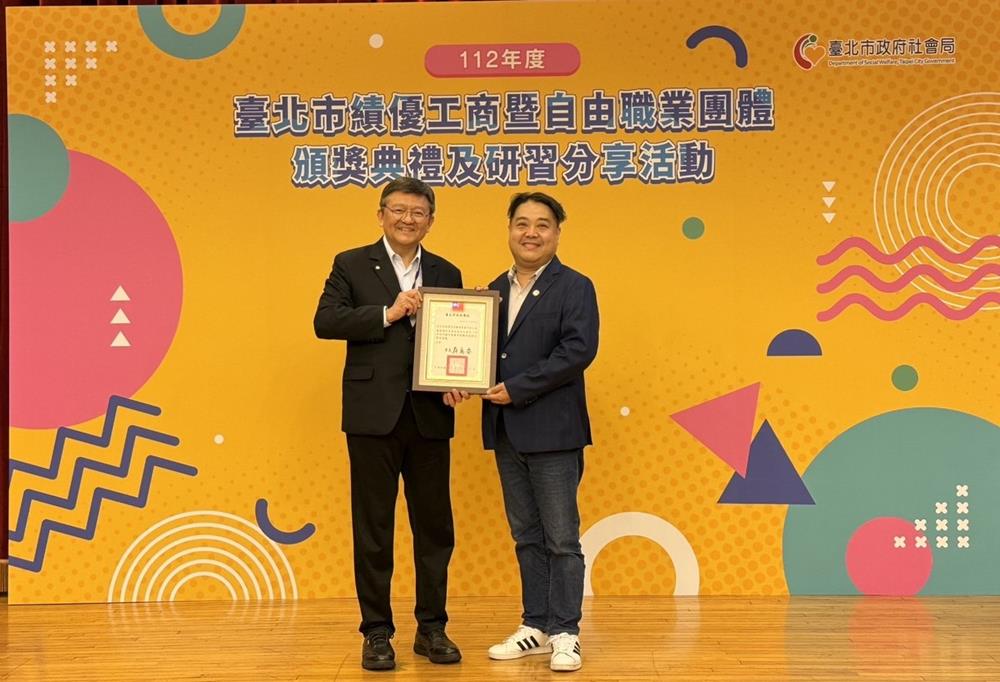 陳柏勳理事長出席社會局舉辦「112年度臺北市工商暨自由職業團體頒獎活動」,由副秘書長林哲宏先生頒發「優等團體獎」獎狀。