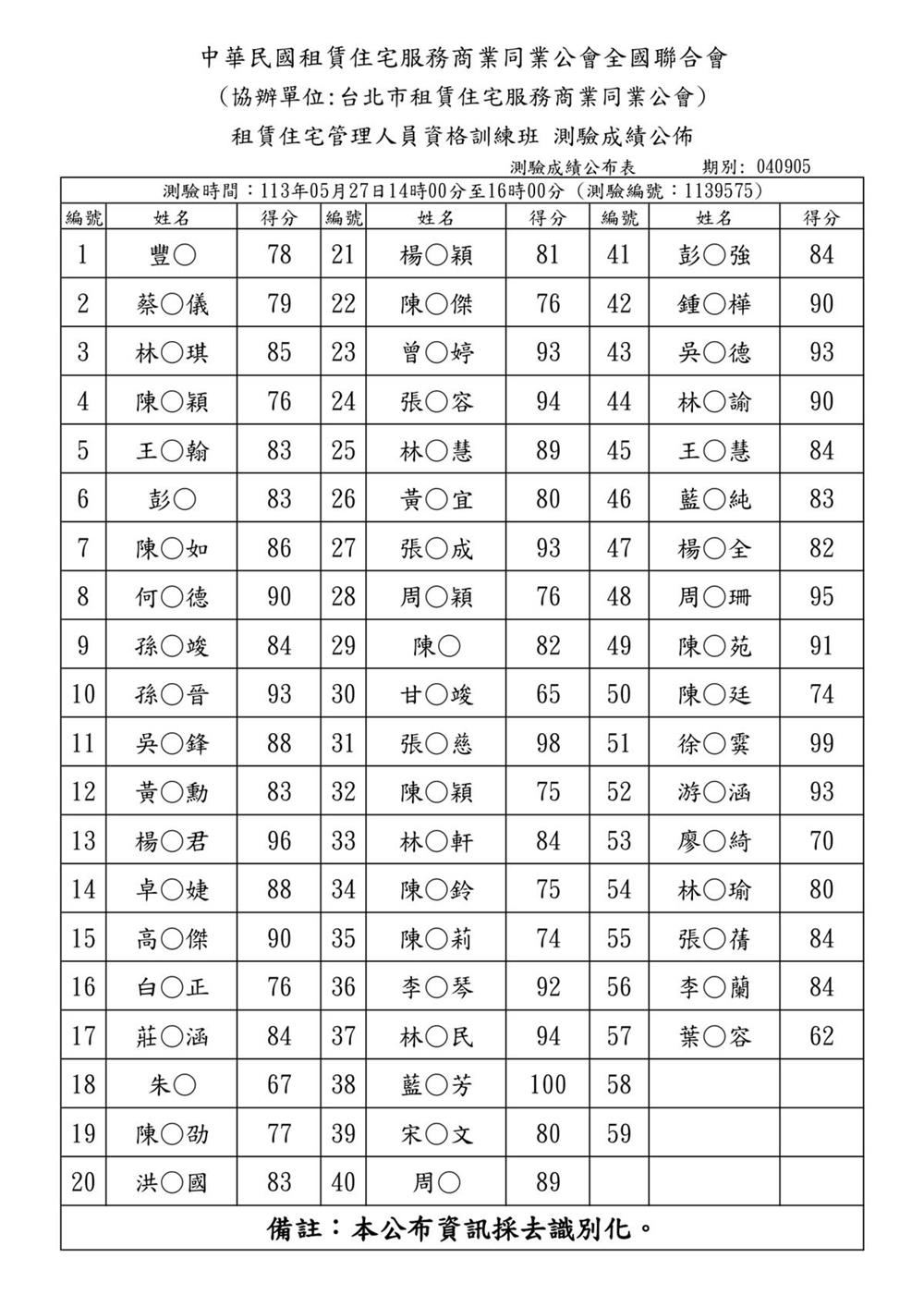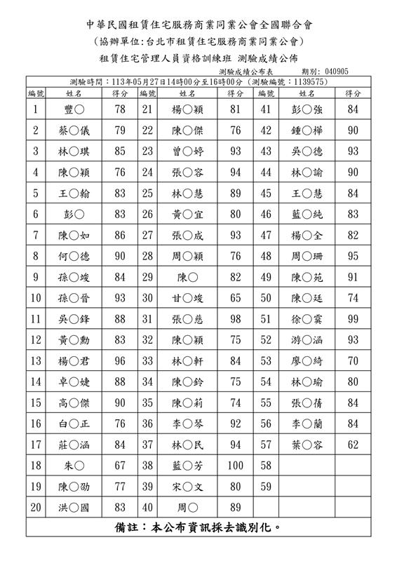 (初訓)113年5月份【租賃住宅管理人員專業訓練班】測驗成績單
