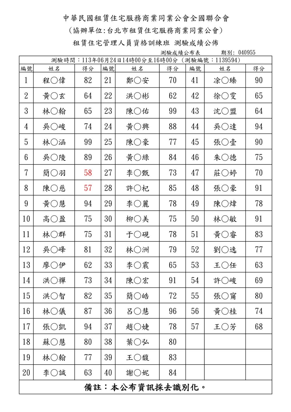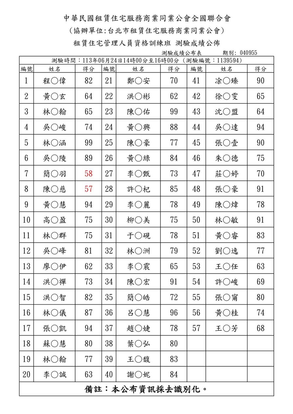 (初訓)113年6月份【租賃住宅管理人員專業訓練班】測驗成績單