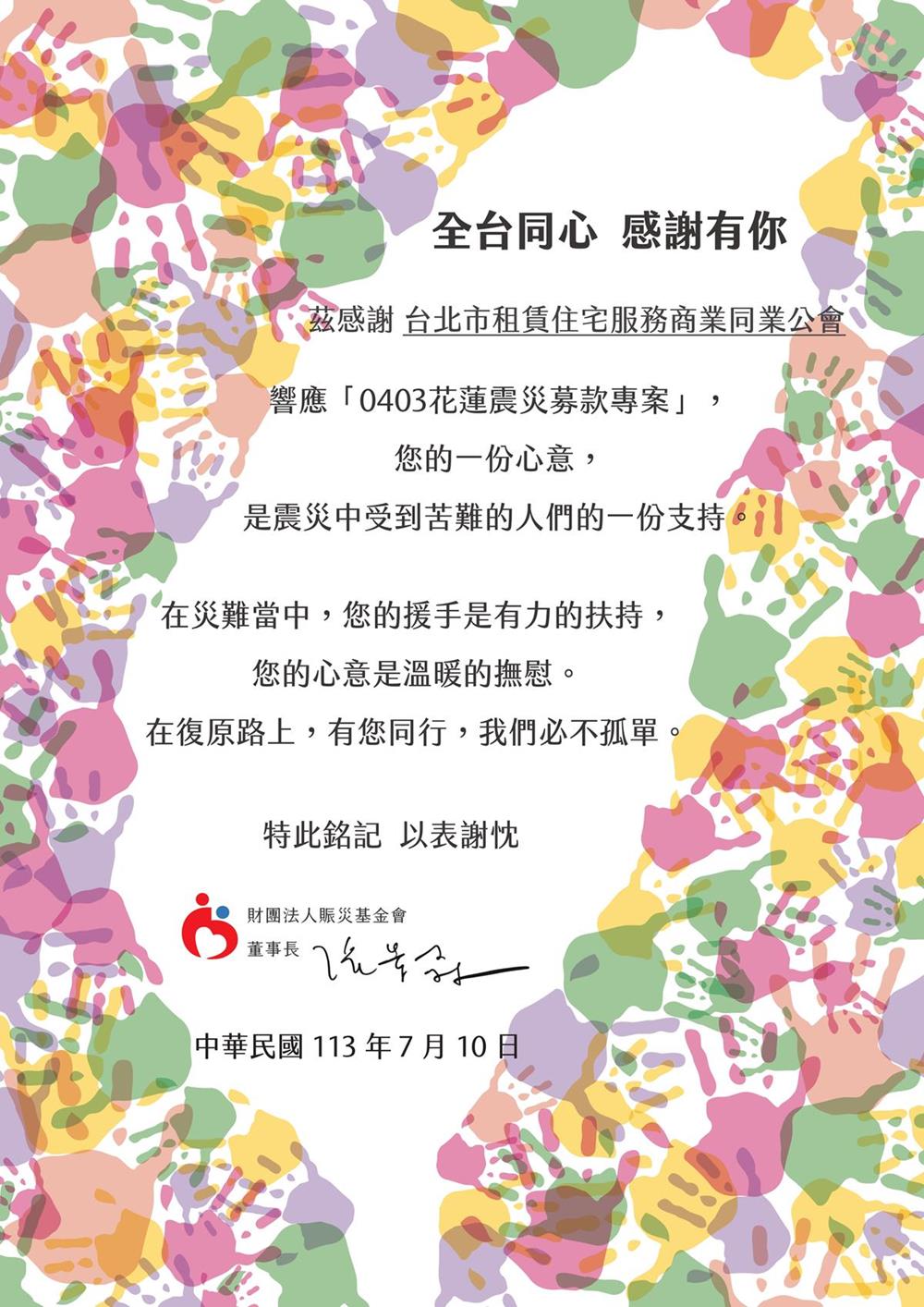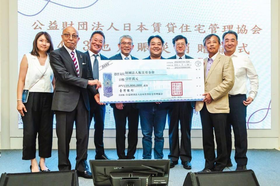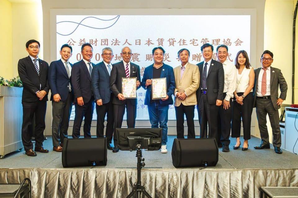 台日友好再寫一筆!日本公益財團法人日本賃貸住宅管理協會,透過台北市租賃住宅服務商業同業公會,捐贈賑災基金會千萬日幣(約200萬元新臺幣)善款予0403震災戶,昨日台北租服公會特別舉辦,捐款儀式暨感恩餐會,日管協團隊特地從日本前來,前內部次長花敬群、地政司司長王成機、台北市地政局長陳信良皆到場致意。