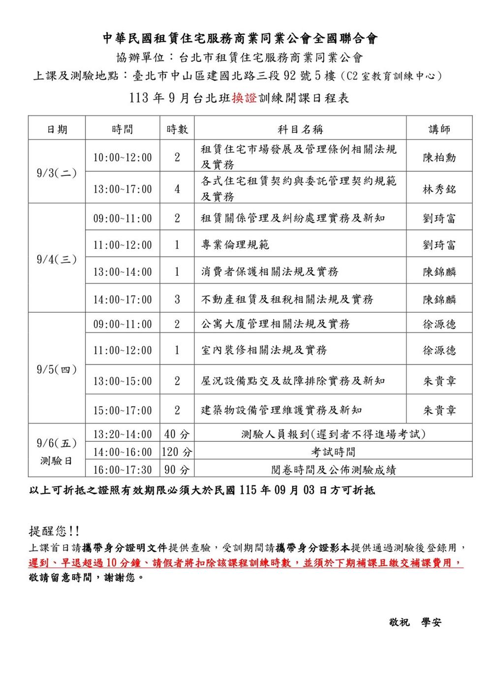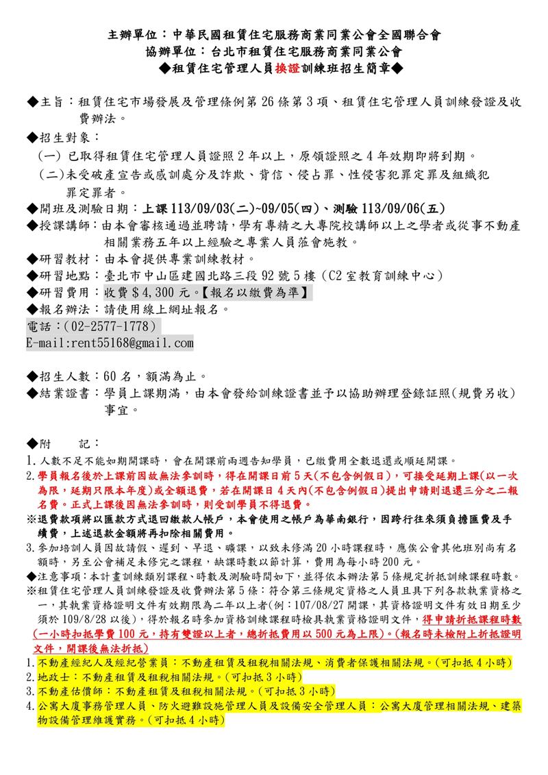 (複訓)113年9月份【租賃住宅管理人員專業訓練班】