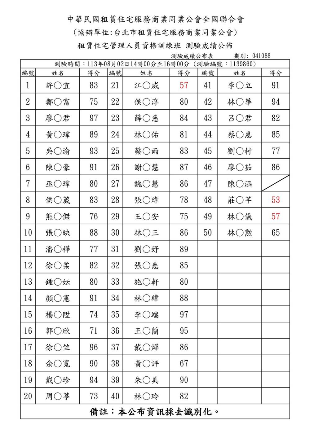 (初訓)113年7月份【租賃住宅管理人員專業訓練班】測驗成績單