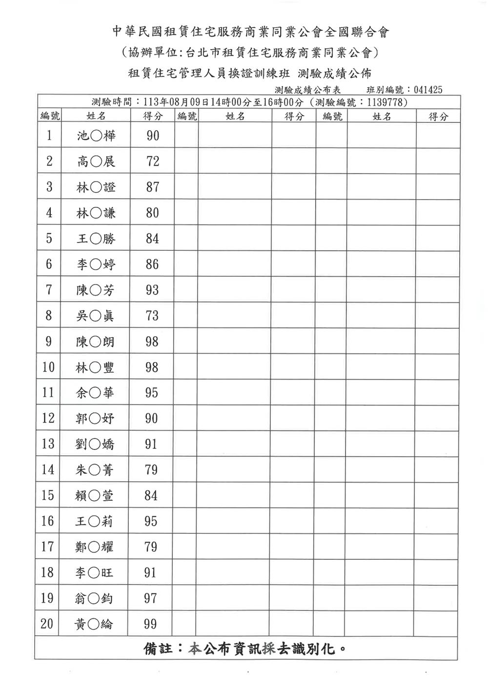 (複訓)113年8月份【租賃住宅管理人員專業訓練班】測驗成績單