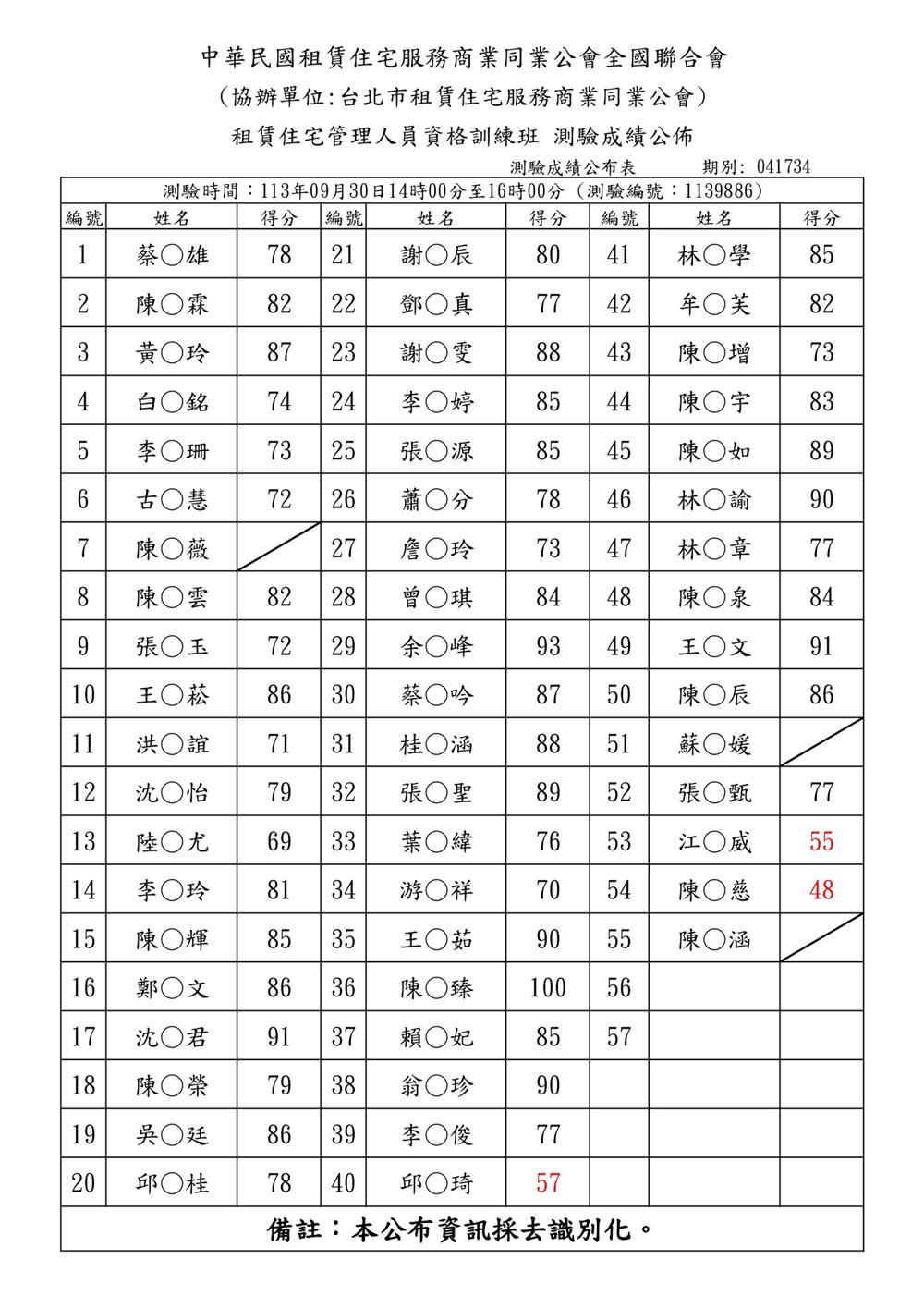 (初訓)113年9月份【租賃住宅管理人員專業訓練班】測驗成績單
