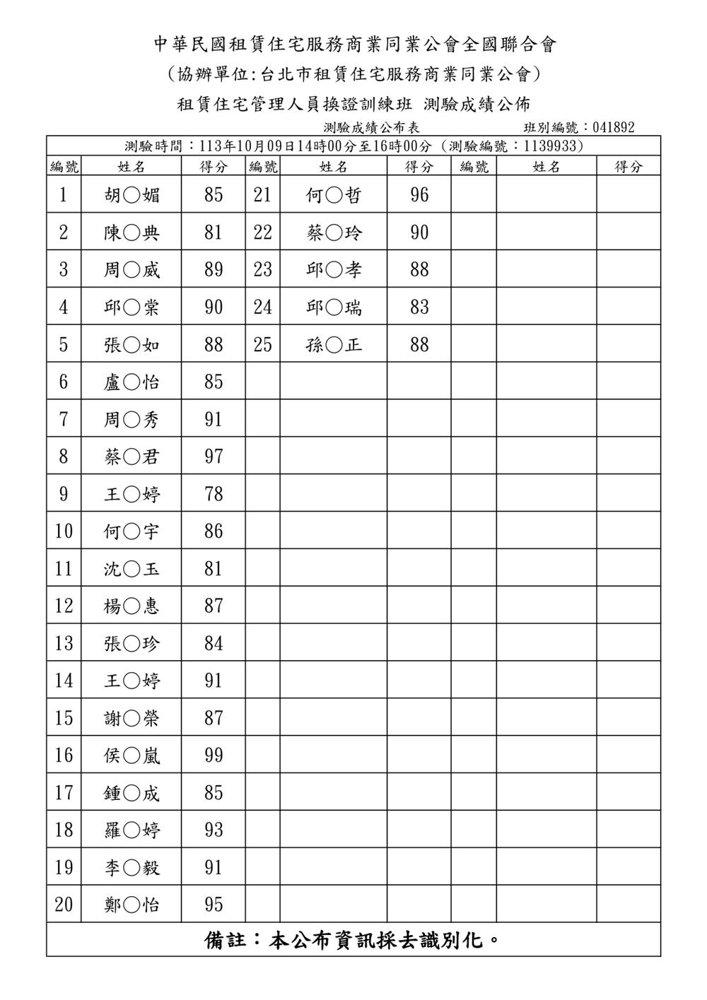 (複訓)113年10月份【租賃住宅管理人員專業訓練班】測驗成績單