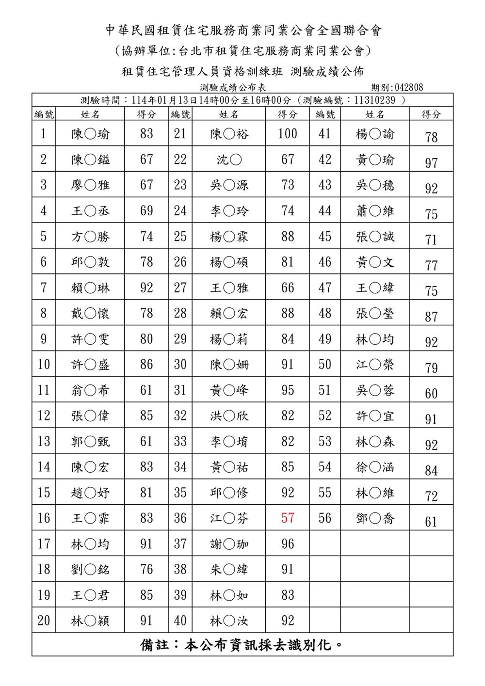 (初訓)114年1月份【租賃住宅管理人員專業訓練班】測驗成績單