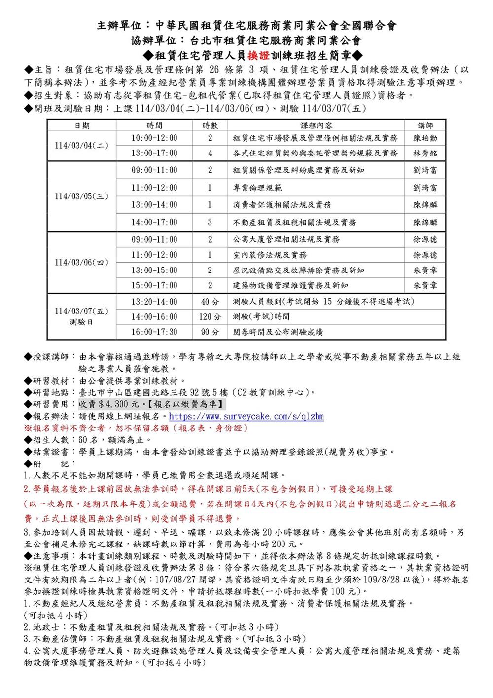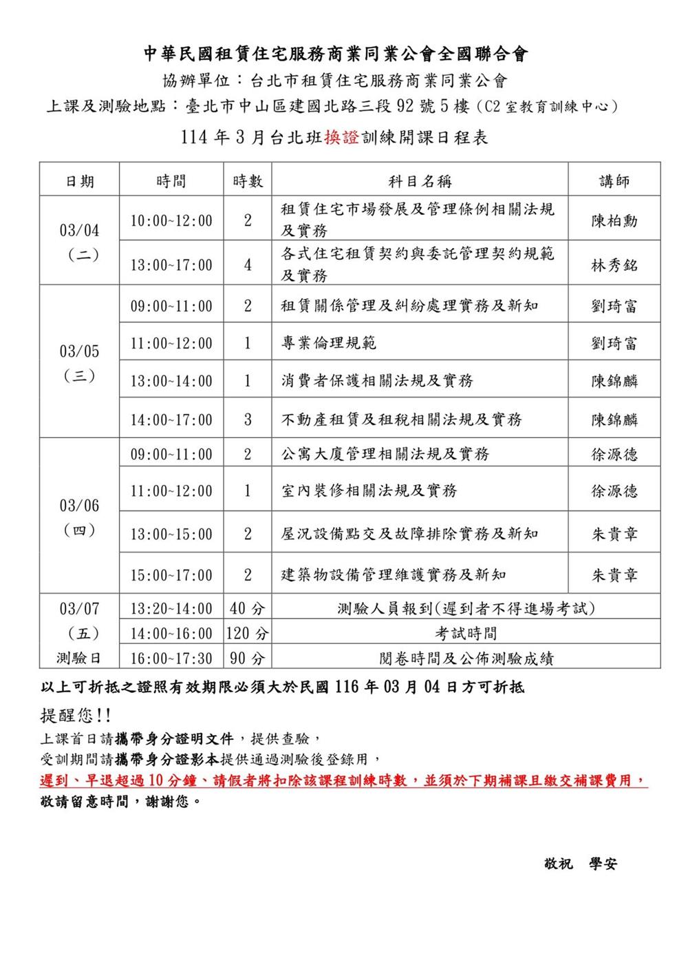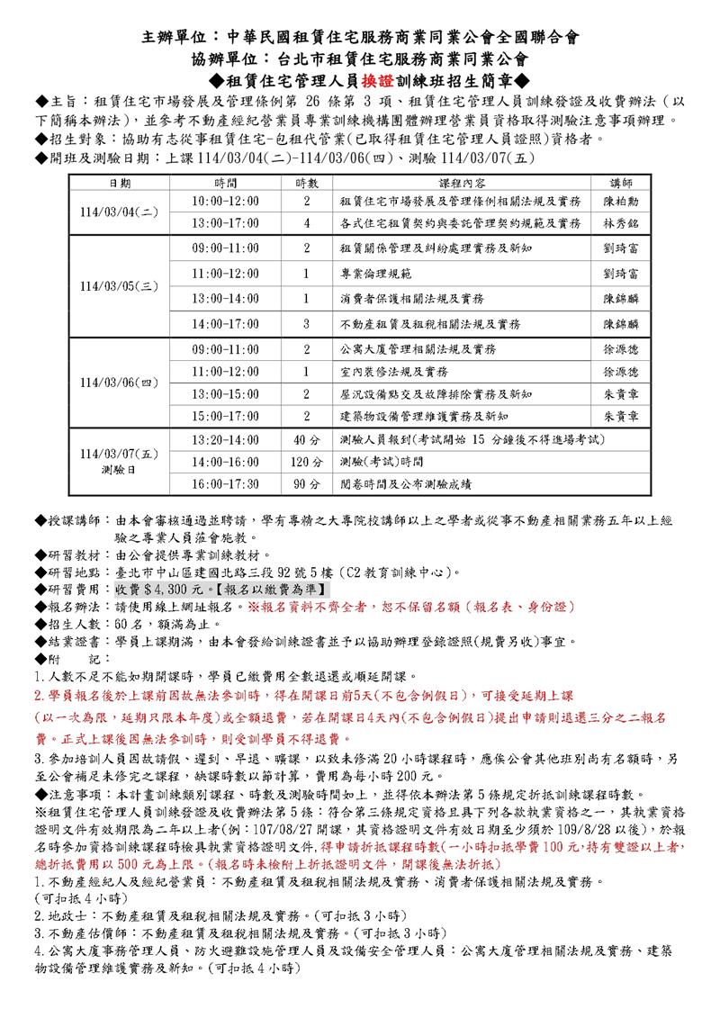 (複訓)114年3月份【租賃住宅管理人員專業訓練班】
