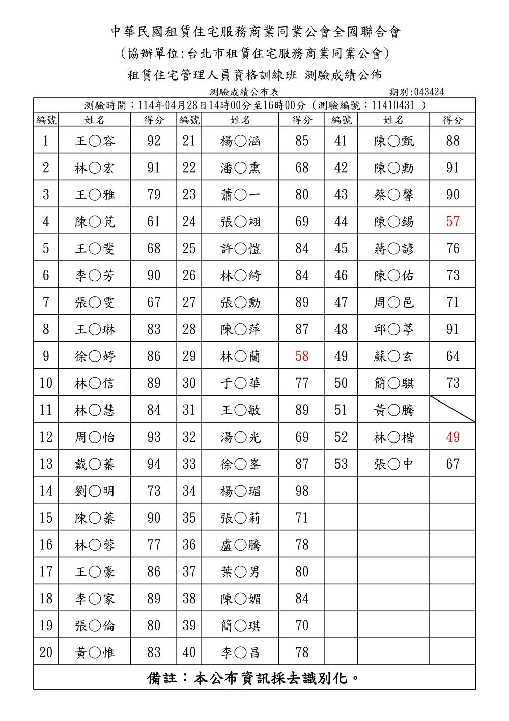 (初訓)114年4月份【租賃住宅管理人員專業訓練班】測驗成績單